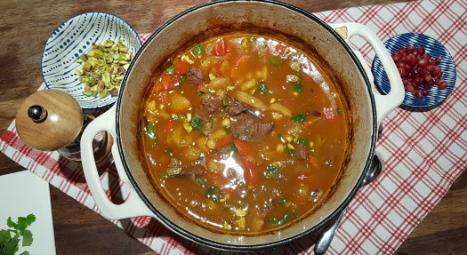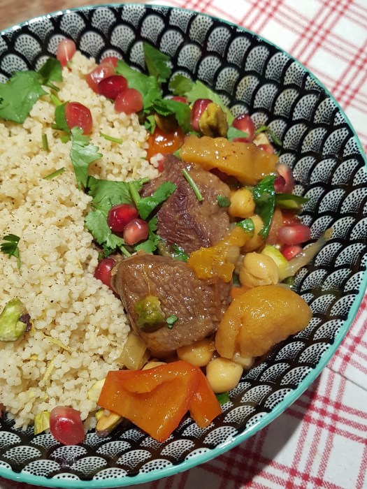 - Serve the stew with the couscous, chopped coriander, pistachio nuts and pomegranate seeds. Enjoy the warm stew!