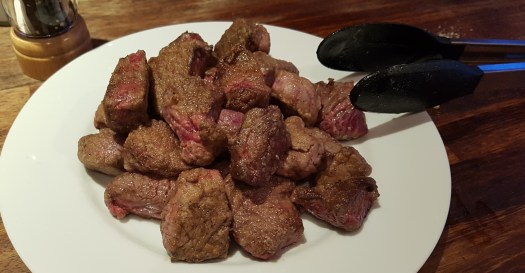 - Chop the beef into 2cm chunks and toss in the flour, salt and black pepper until all sides are covered.